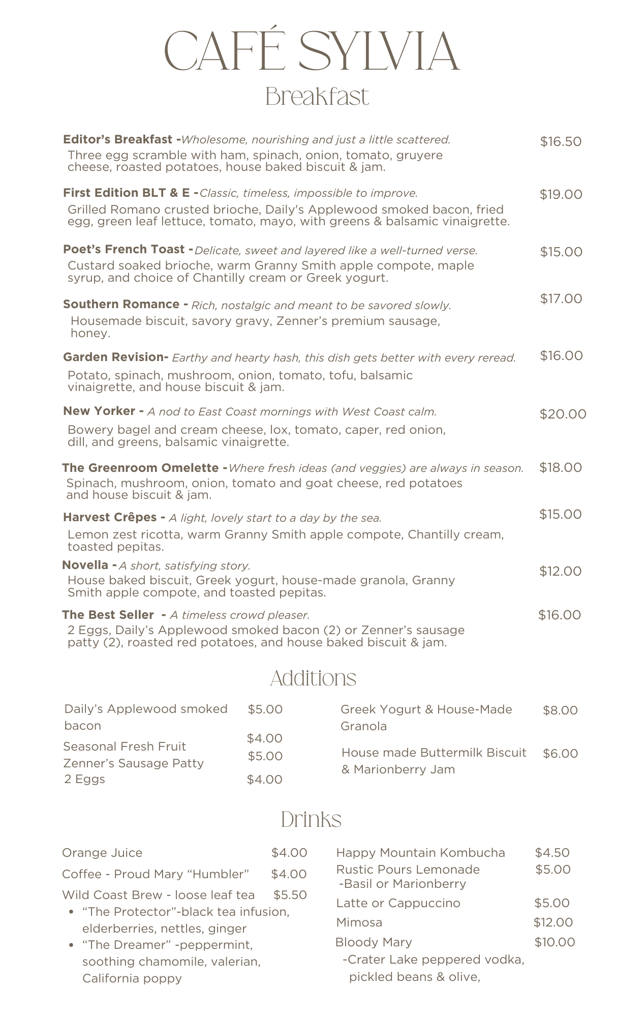 - Contact: 541.265.5428 or Cafe@HotelSylvia.com