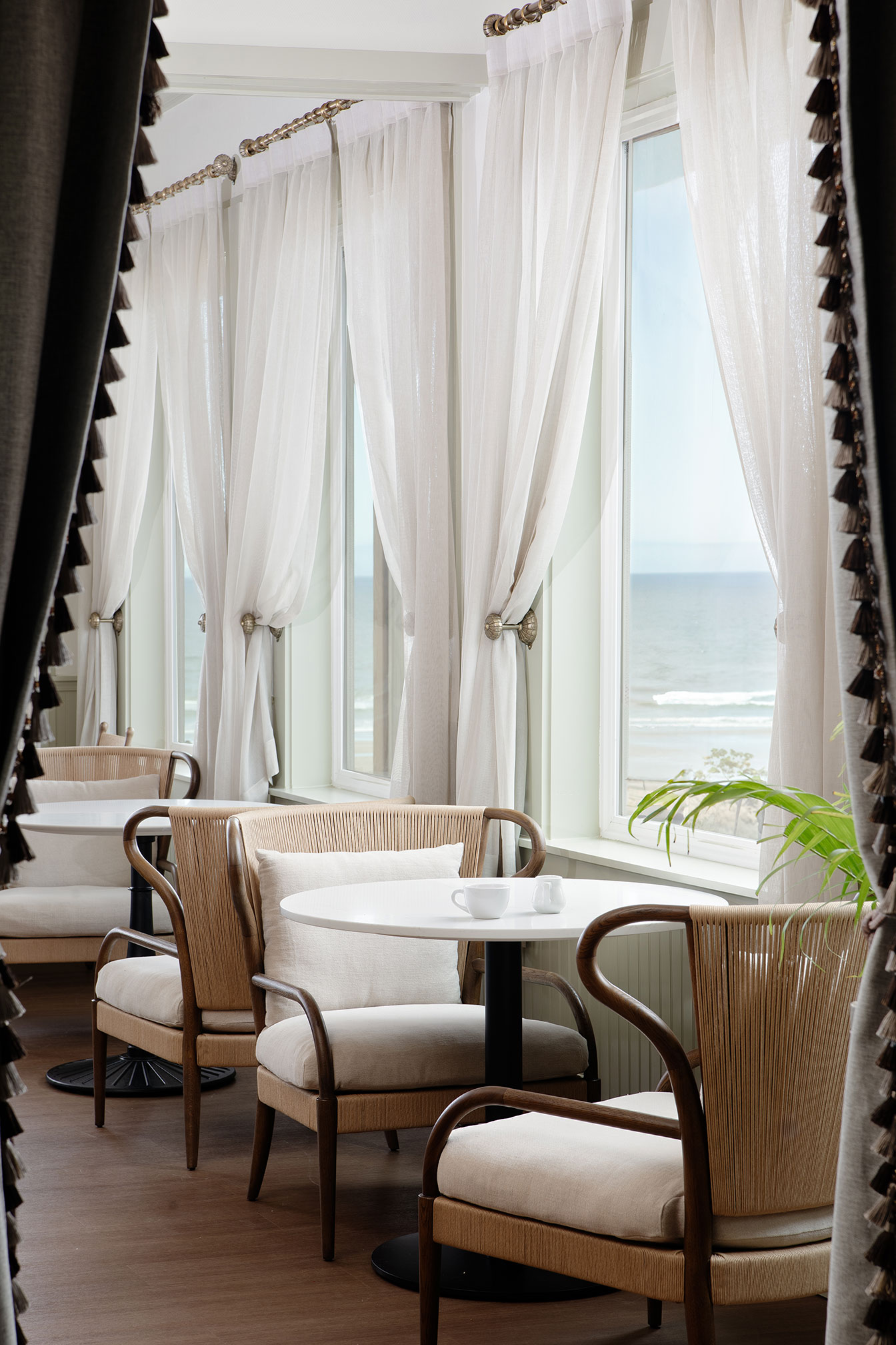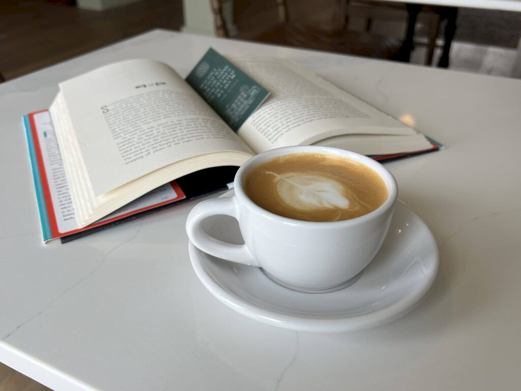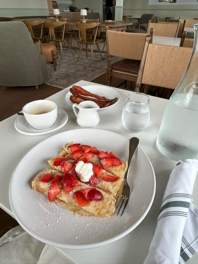 Hotel Sylvia, in Newport, Oregon, offers breakfast options for guests and visitors alike. Behind the front desk, a cozy coffee bar serves espresso in a warm, inviting space for a hot beverage. Downstairs at the basement level, the café provides a calming setting for a delicious meal, with sweeping ocean views from the cliffs of Nye Beach.